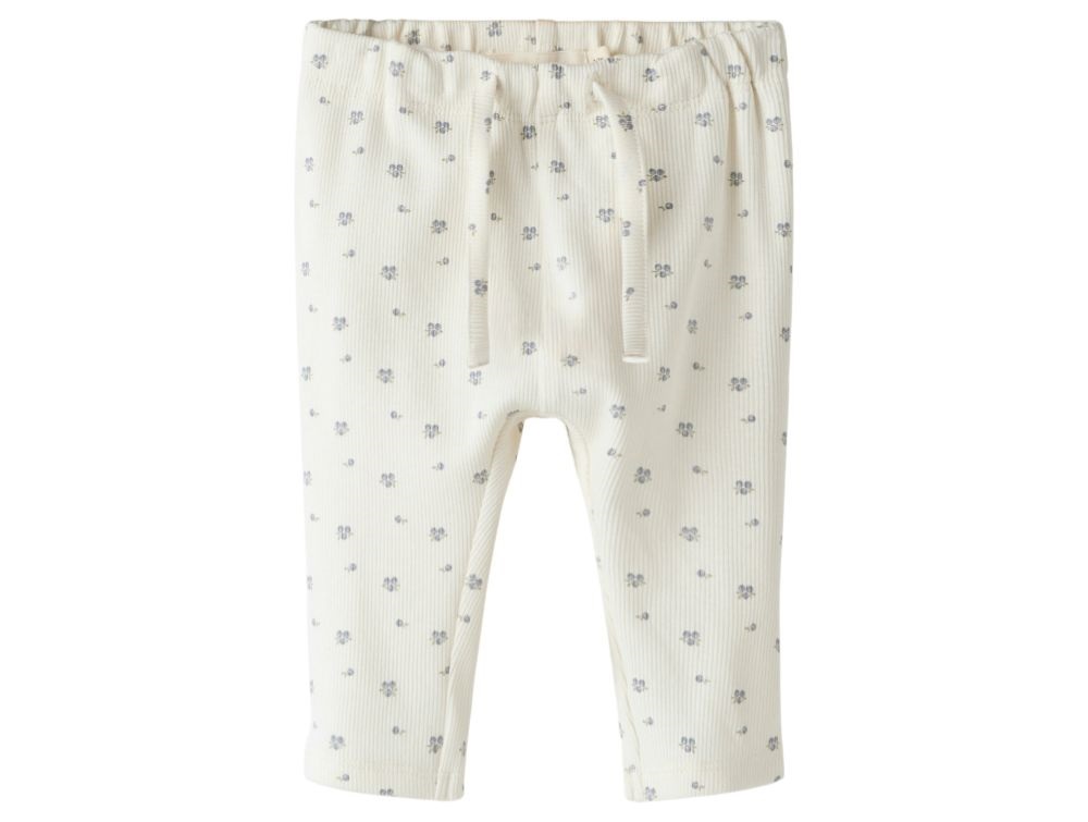 Ribstrikkede bukser i råhvid nuance (coconut milk) fra Lil' Atelier med et sødt blåbærprint. Modellen har almindelig pasform, bindebånd i taljen og indvendig elastik, der kan justeres med knap for optimal komfort.