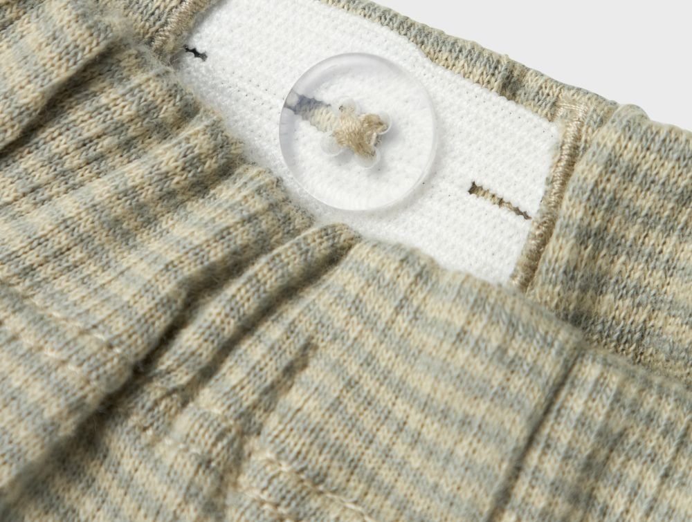 Bukserne er lavet i let ribbet jersey med økologisk og genanvendt bomuld. De har justerbar elastik i livet og en enkel knapdetalje på lommen.