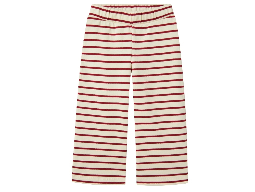 Bukser i råhvid nuance fra Lil' Atelier med røde striber. En blød jerseymodel med elastik i taljen og brede ben, som giver et afslappet og behageligt fit.