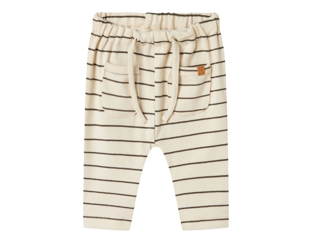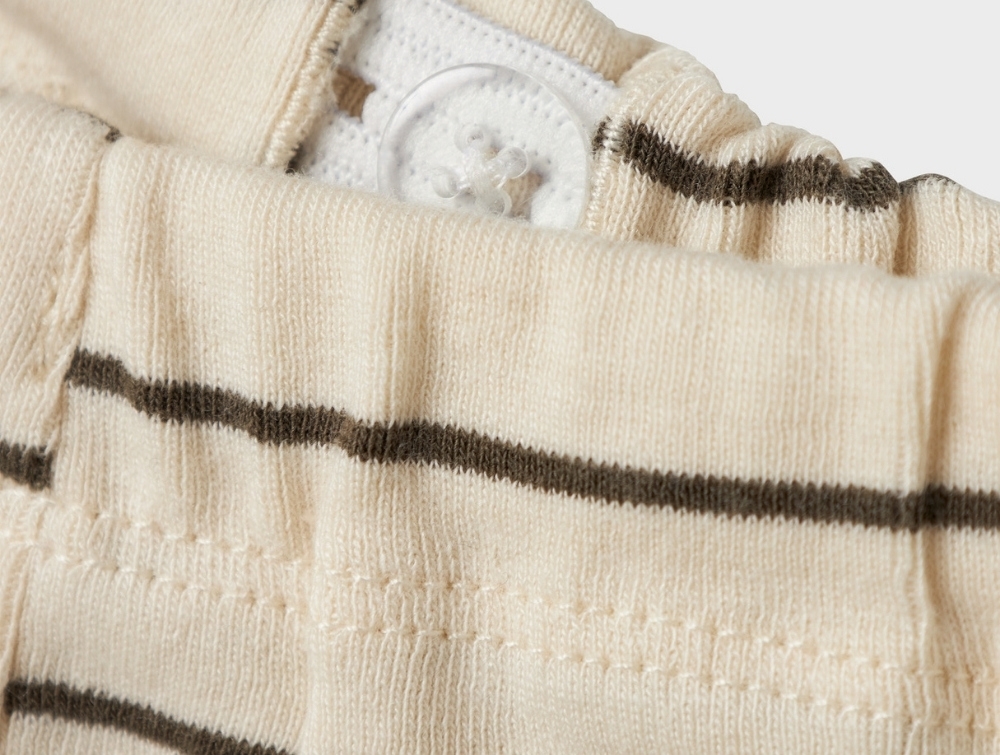 Bukser i råhvid nuance fra Lil' Atelier med tynde brune striber. Modellen har elastik i taljen med fast bindesnor og justerbar indvendig elastik, som sikrer god pasform. Foran er der to små lommer, og den bløde jerseykvalitet giver behagelig komfort hele dagen.