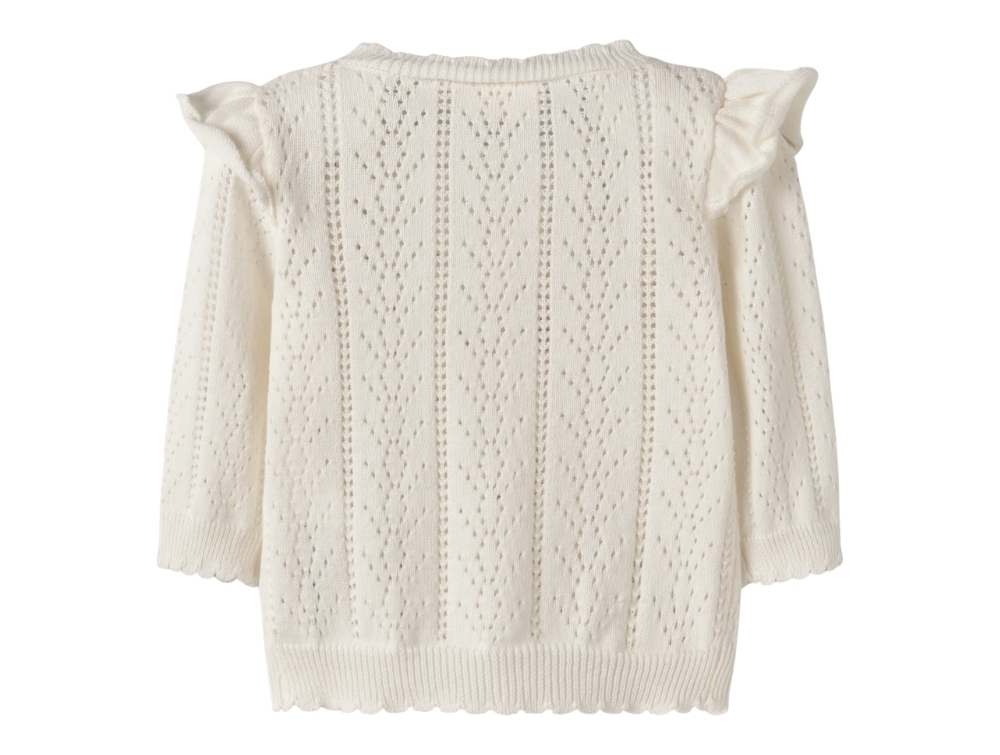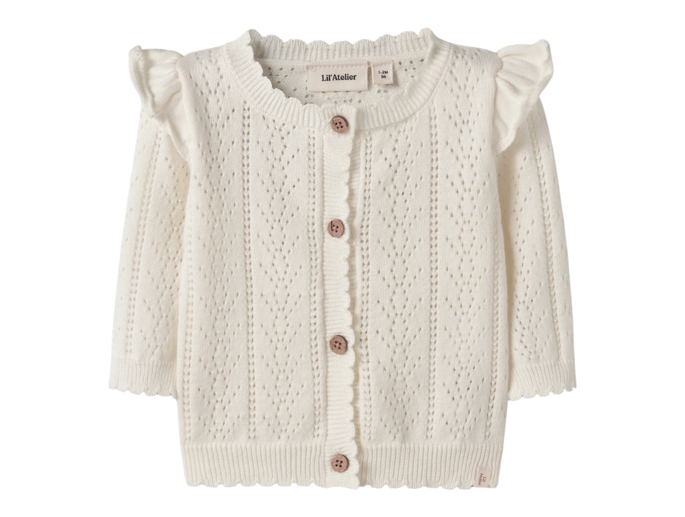 Cardigan i råhvid nuance (coconut milk) fra Lil Atelier med fint hulmønster og flæsedetaljer ved skuldrene.