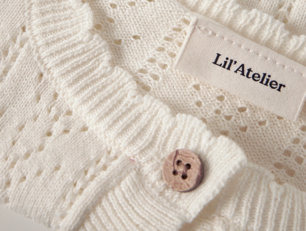 Lil Atelier cardigan i råhvid nuance med hulmønster og flæser
