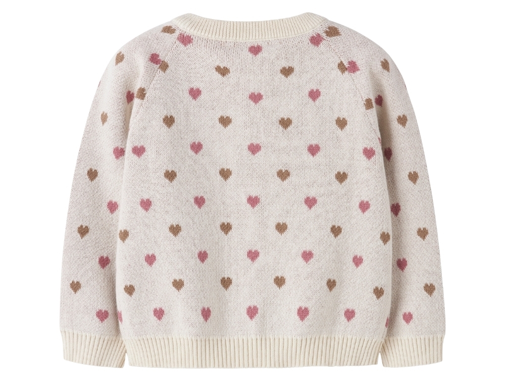 Modellen har et sødt hjerteprint i rosa og brune nuancer, rund hals, lange ærmer og ribkanter. Lukkes med kokosskalknapper foran.