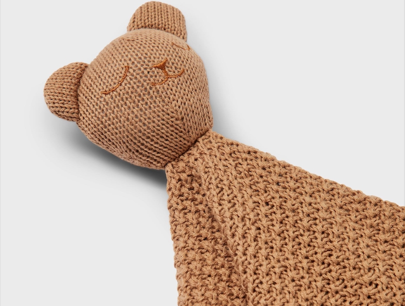 Putteklud i strik med bamse i farven cartouche fra Lil' Atelier.