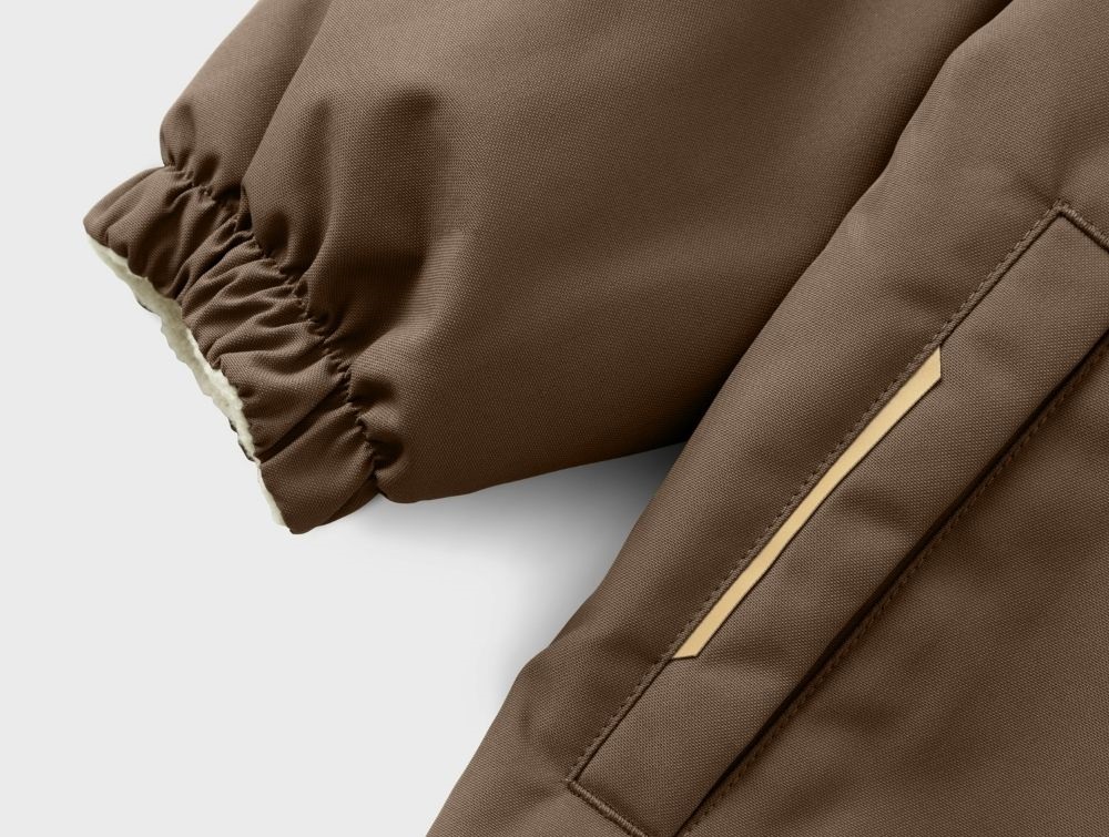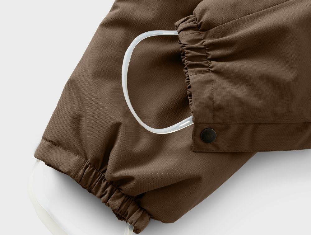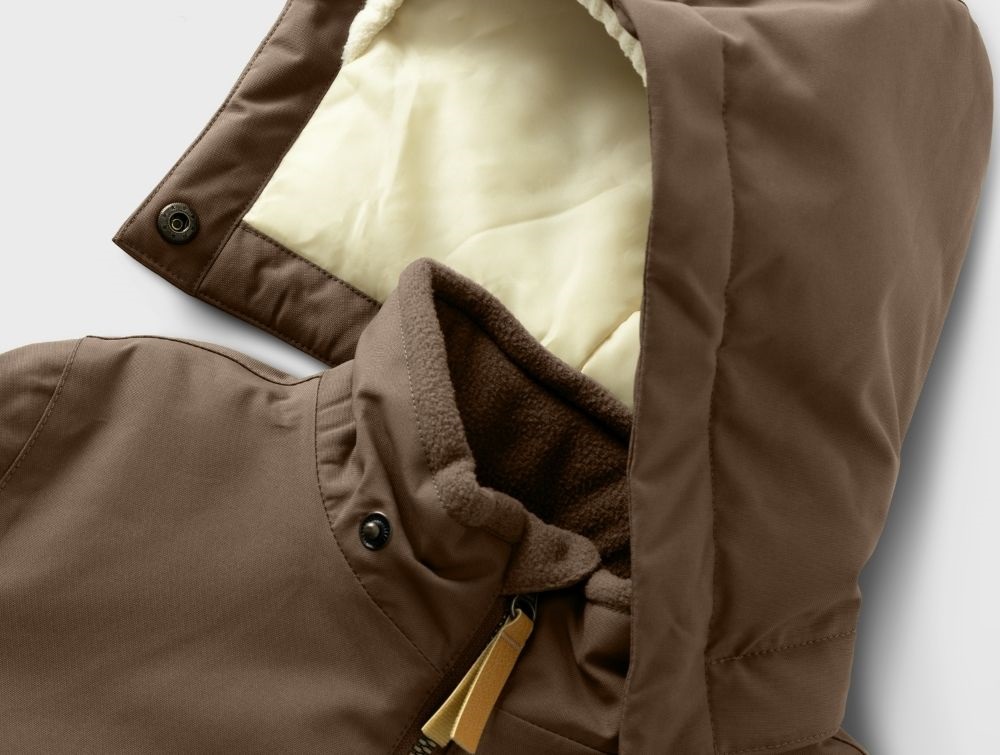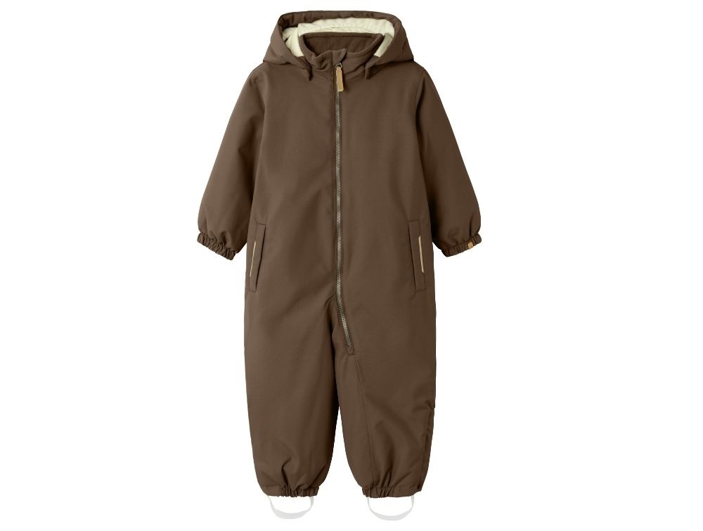 Flyverdragt i farven dark earth fra Lil' Atelier. Flyverdragten har en aftagelig hætte med trykknapper.