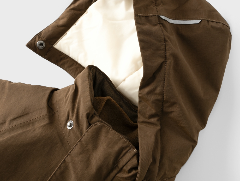 Flyverdragt i farven dark earth fra Lil' Atelier. Flyverdragten har en aftagelig hætte med trykknapper.