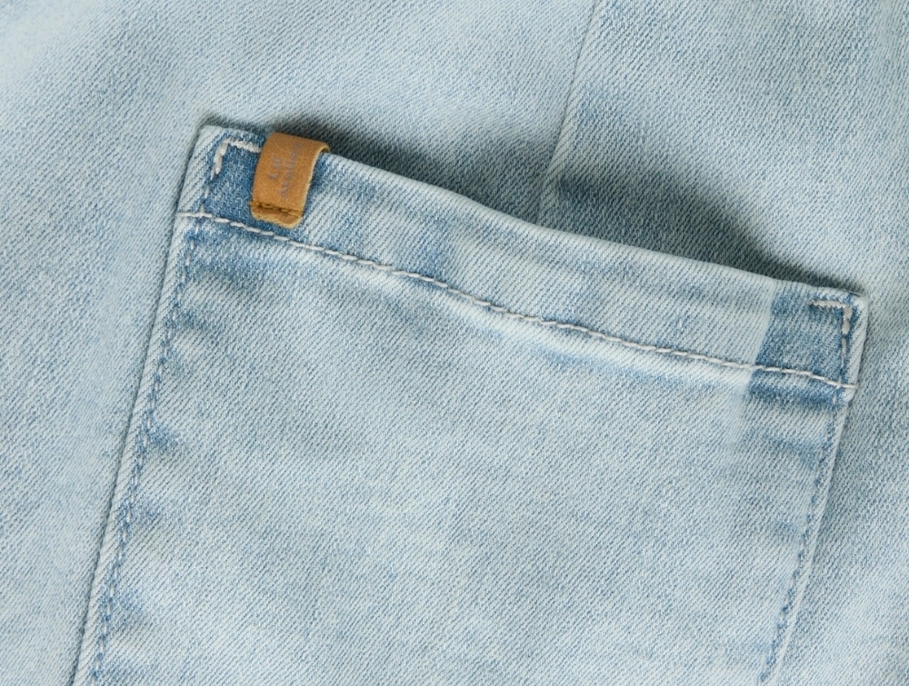 Den lette denimkvalitet består af 70% bomuld (økologisk), 28% polyester (genanvendt) og 2% elastan, som giver stoffet en blød og smidig struktur. Materialet har en klassisk denimoverflade og er behageligt til daglig brug.
