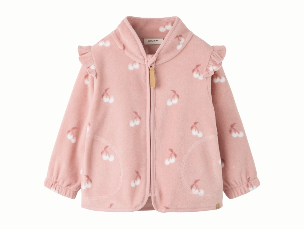 Fleecejakke i rosa nuance (misty rose cherry) fra Lil' Atelier med kirsebærprint og fine flæsedetaljer ved skuldrene.