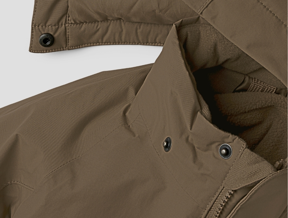 Dragten er fremstillet i 100% nylon med foring i polyester, herunder genanvendt polyester. Materialet er vandafvisende, åndbart og smudsafvisende takket være BIONIC-FINISH® ECO-belægningen, som er fri for skadelige fluorstoffer (PFAS). Med en åndbarhed på 7.000 g/m2/24h og en slidstyrke på 50.000 Martindale sikrer dragten både komfort og holdbarhed. Det bløde fleecefor omkring halsen giver ekstra varme.