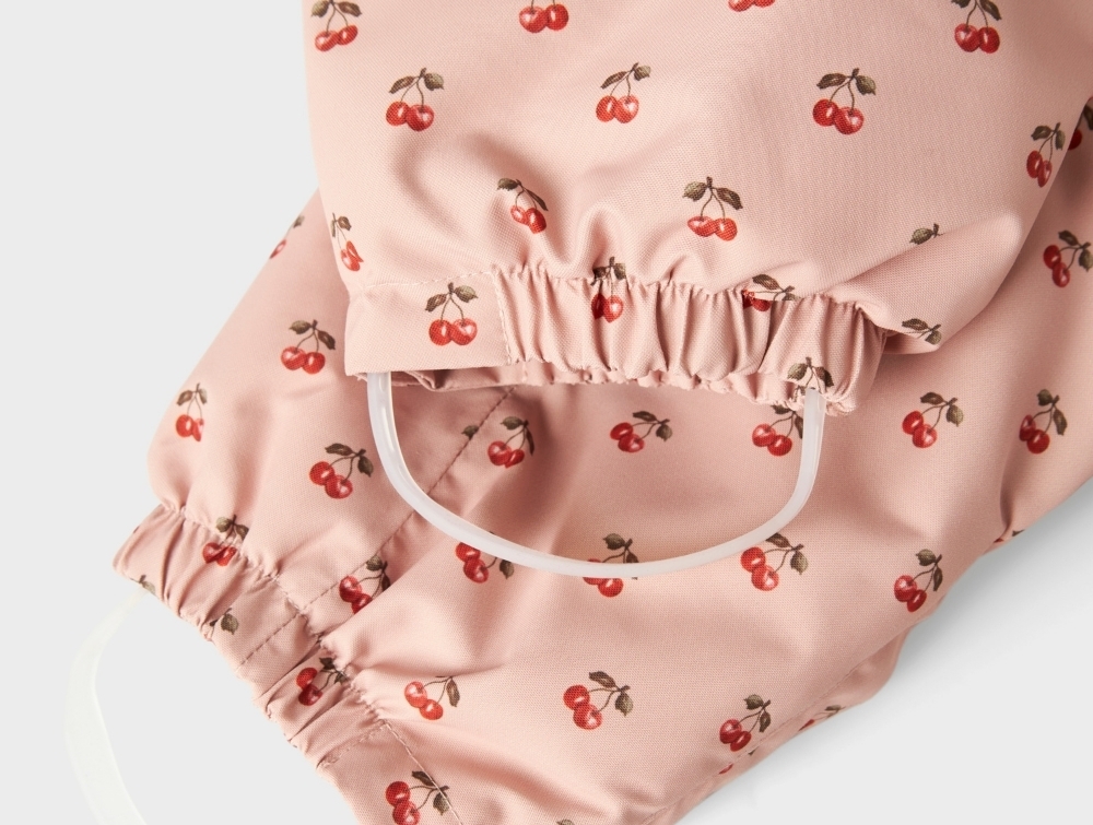 Lil' Atelier flyverdragt i rosa med kirsebærprint, aftagelig hætte og refleksdetaljer