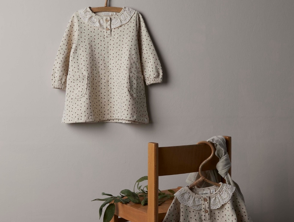 Blød sweatkjole i farven fog med blomsterprint fra Lil' Atelier.