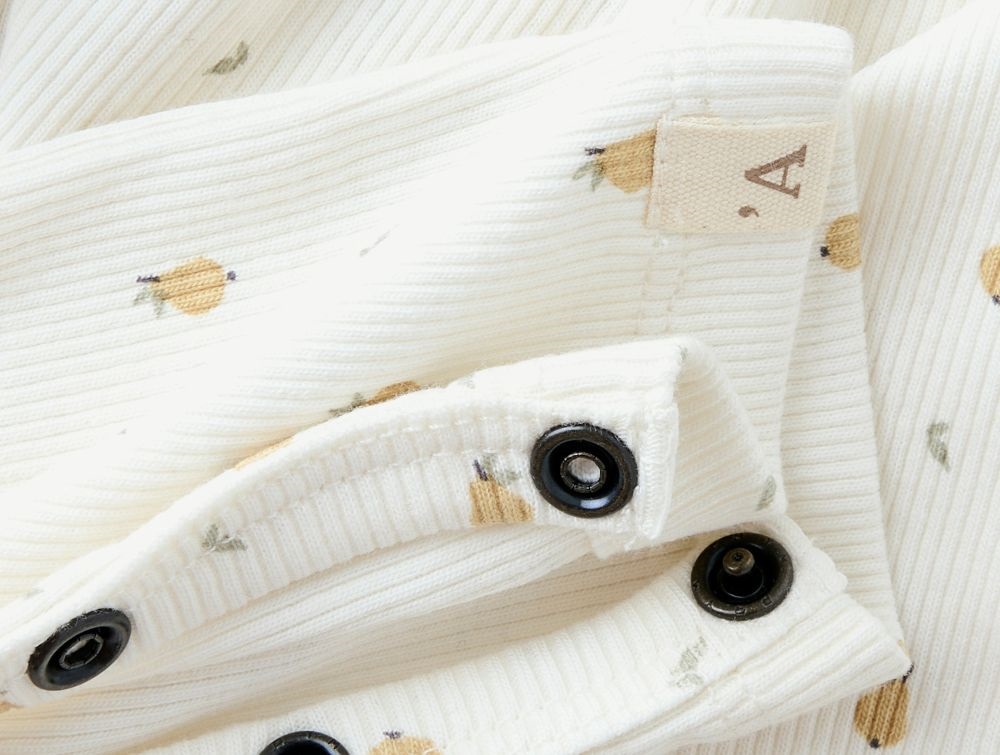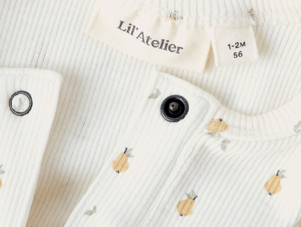 lil\' atelier heldragt i råhvid med små gule pærer og trykknapper, set forfrababy iført lil\' atelier heldragt med pæreprint, hånd på benetnærbillede af trykknapper og pæreprint på lil\' atelier heldragtlabel og halsudskæring med trykknap på lil\' atelier heldragt i rib