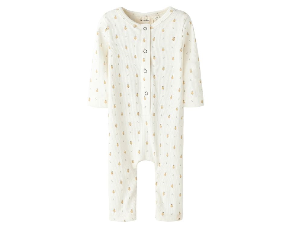 Heldragt i ribstrikket kvalitet fra Lil' Atelier i råhvid nuance (coconut milk) med et fint all-over print af små gule pærer. Modellen har lange ærmer og lukkes med trykknapper foran for nem omklædning.