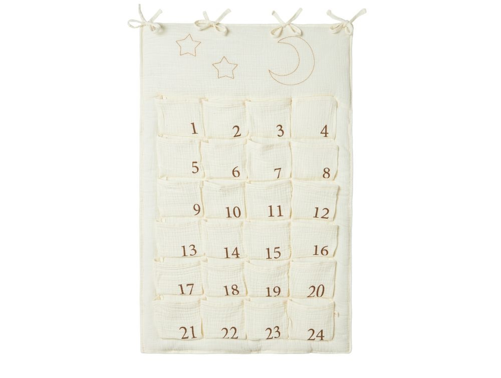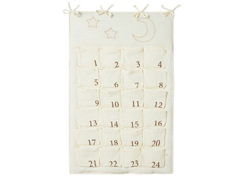 Vægophængt julekalender i quiltet muslinkvalitet med 24 lommer til små gaver og overraskelser. Hver lomme har mørkebrune printede tal fra 1 til 24. Øverst på kalenderen er der broderet to gyldne stjerner og en måne, som tilføjer et fint og stemningsfuldt udtryk. Kalenderen hænges op med bindebånd i toppen.