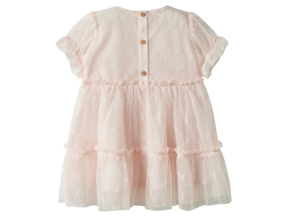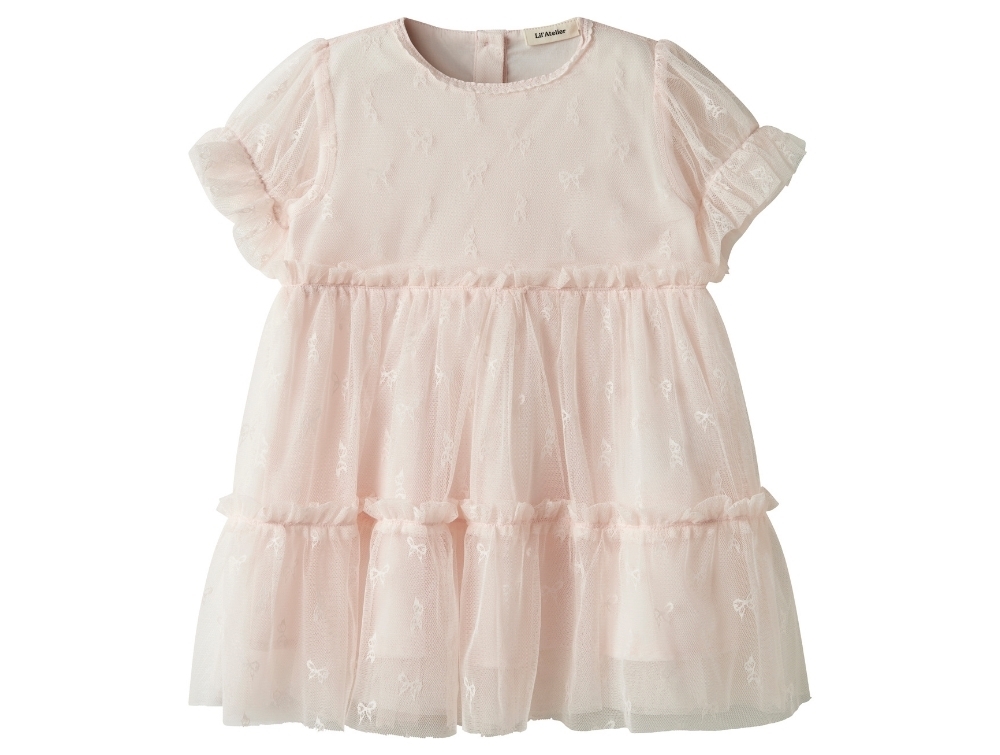Lil\' Atelier kjole i almost mauve med tyl og flæserBarn iført Lil\' Atelier kjole i rosa nuance med tylDetalje af Lil\' Atelier kjole i almost mauve med knaplukningBagside af Lil\' Atelier kjole i almost mauve med tyl