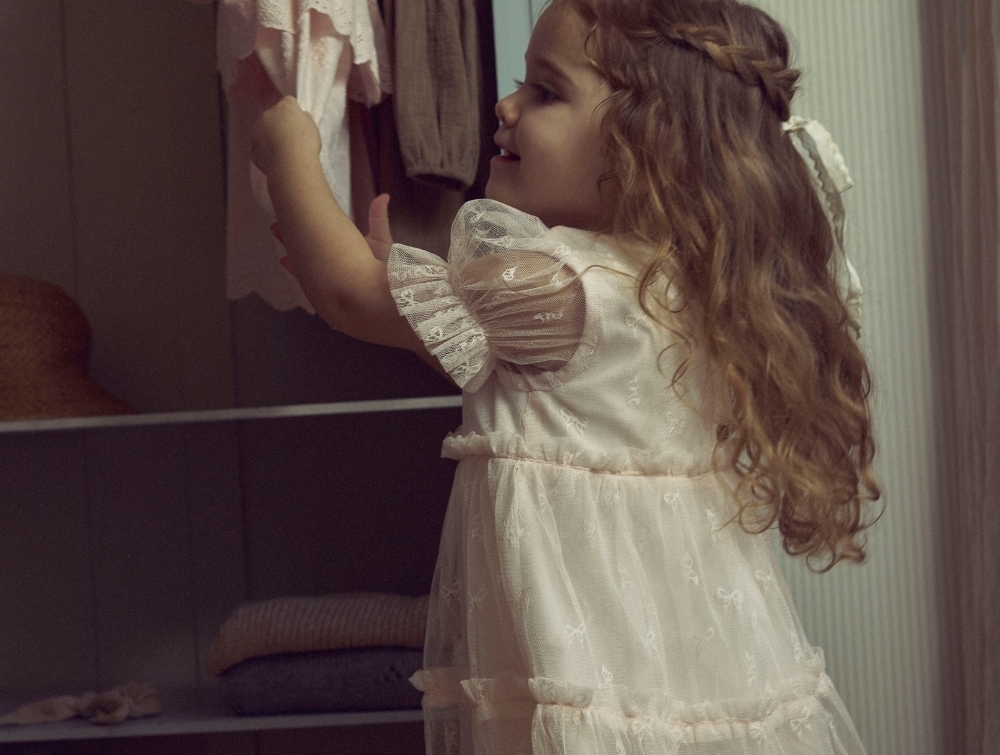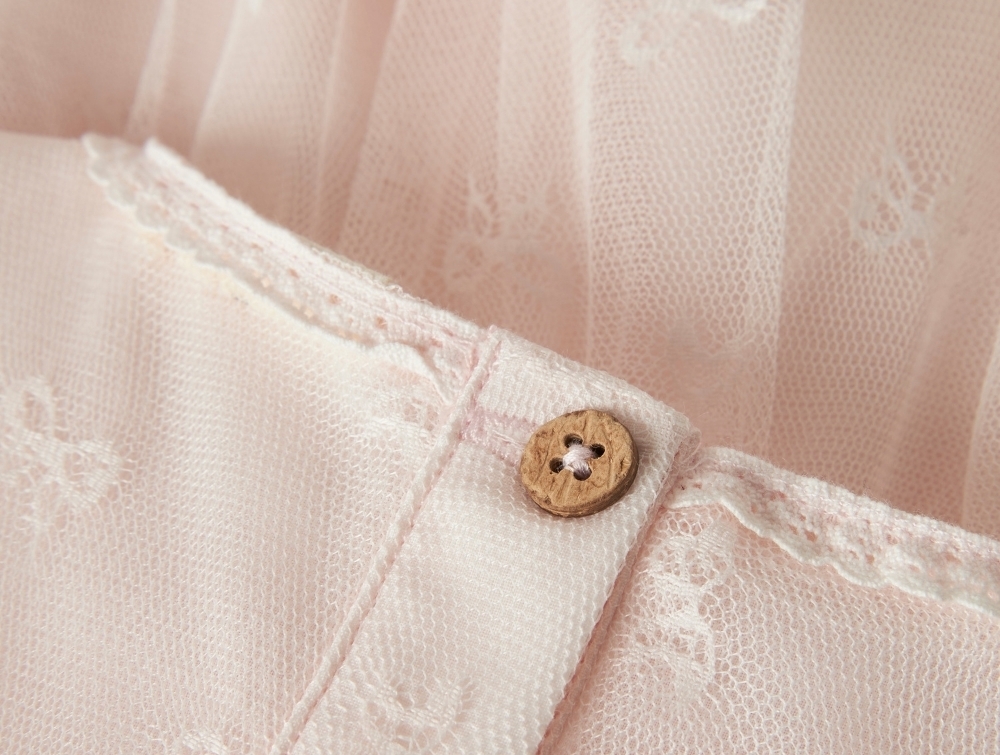 Modellen har korte pufærmer, rund hals og et skørt i flere lag tyl med fine flæsedetaljer. Tyllen har et fint mønster af små sløjfer. Lukkes bagtil med knapper.