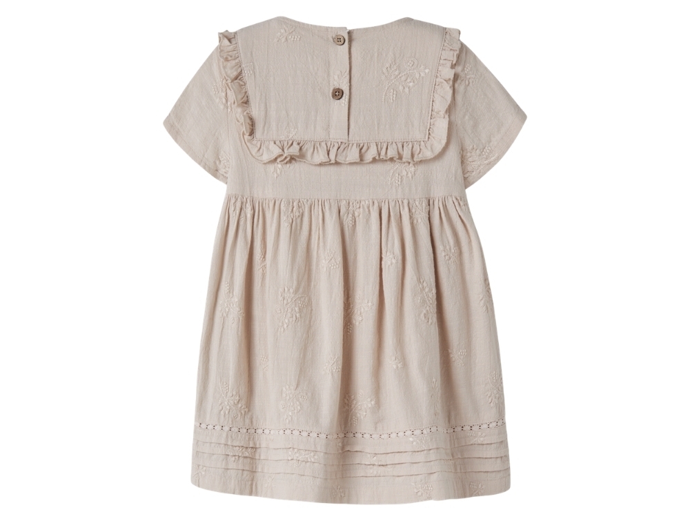 Kjole i beige nuance (pumice stone) fra Lil' Atelier med broderede detaljer og fine flæser ved bryst og skuldre.