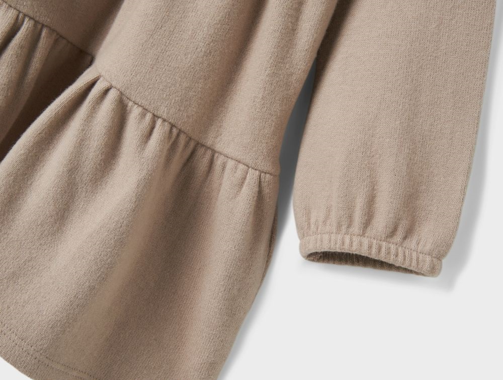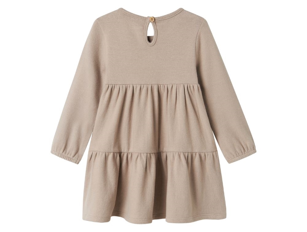 Kjolen er lavet i en blød og strækbar jersey-kvalitet. Den har en klassisk o-hals og lange ærmer med elastiske manchetter. Knaplukningen gør det nemt at tage kjolen af og på.