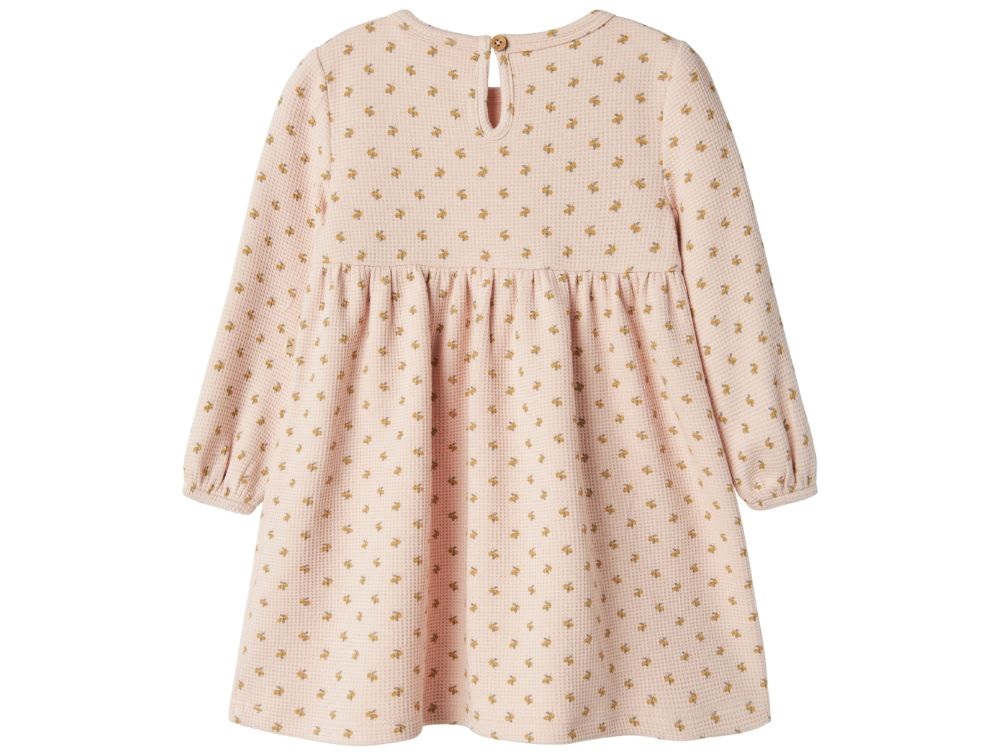 Langærmet kjole i en lyserød nuance med små blomster i grønne og gul-brune toner. Kjolen har en rund halsudskæring og lukkes med en knap og løkke i nakken. En overskæring med rynk skaber en fin vidde, og elastik ved håndleddene sikrer en god pasform.