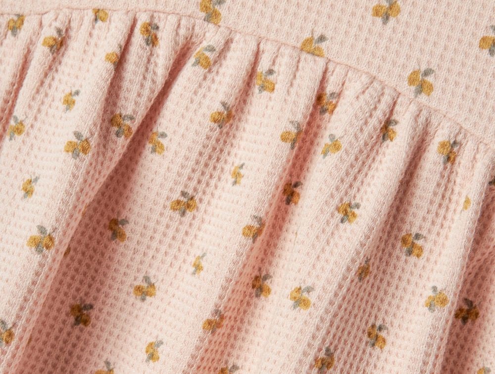 Lyserød kjole med blomster fra Name it 13240318 peach whipLyserød kjole med blomster fra Name it 13240318 peach whip bagfraOverskæring med rynk på lyserød kjole med blomster fra Name it 13240318 peach whip