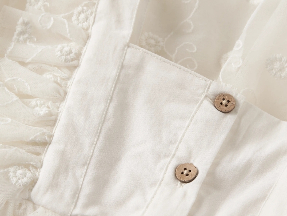 Kjolen er fremstillet i 100% bomuld (økologisk) med et let lag tyl i bomuld og nylon, som giver et luftigt fald og fremhæver de broderede detaljer. Materialet føles blødt mod huden og egner sig til brug, hvor der ønskes en let og dekorativ kjole.