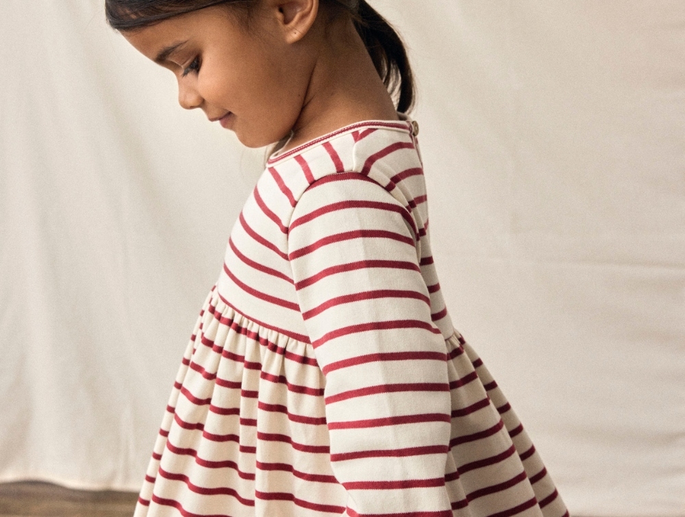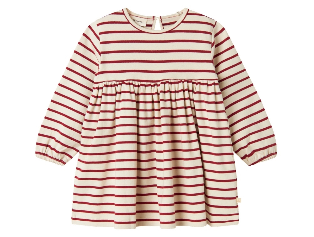 Kjole i råhvid nuance fra Lil' Atelier med fine røde striber. En blød jerseykjole med lange ærmer og en løs pasform, der giver bevægelsesfrihed i hverdagen.