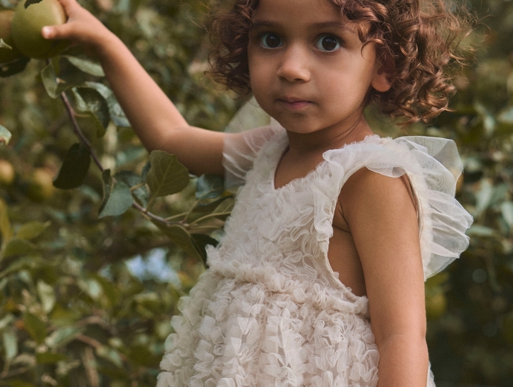Lil\' Atelier kjole i graabeige nuance med tyl og blomsterstruktur pa barnLil\' Atelier kjole i graabeige nuance med tyl og blomsterstruktur set forfraLil\' Atelier kjole i graabeige nuance med detaljer i tyl og strukturLil\' Atelier kjole i graabeige nuance med tyl og blomsterstruktur set bagfra