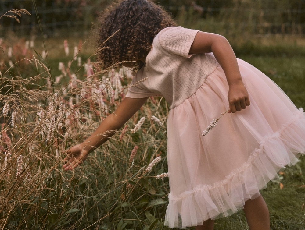 Kjolen er fremstillet i 100% bomuld (økologisk), som føles blødt mod huden, mens tylskørtet består af polyester (genanvendt) og tilfører et let lag med volumen. Materialerne giver en god balance mellem struktur og bevægelighed.