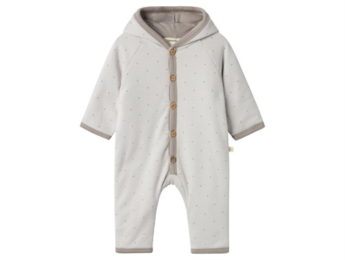 Dejlig blød køredragt fra Lil' Atelier i en lys grå nuance med små prikker i en varm grå tone. Dragten er fremstillet af en blød blanding af bomuld, modal og elastan, der sikrer høj komfort og bevægelighed. Den lette polstring gør den ideel til de mellemliggende sæsoner.