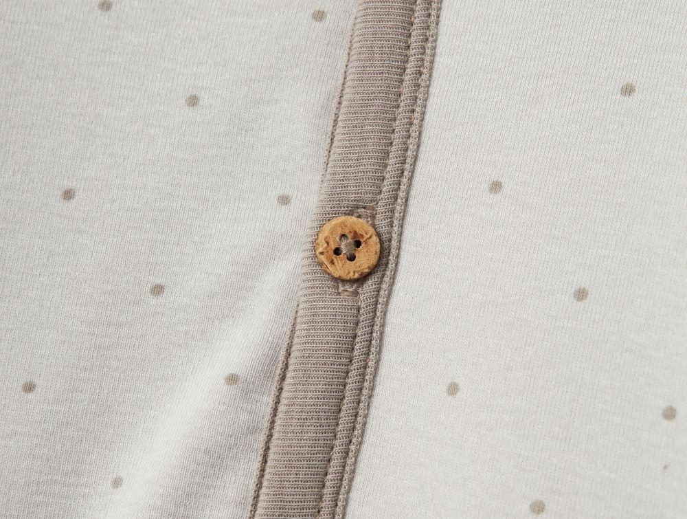 Designet har en knaplukning med knapper lavet af kokosskaller samt manchetter ved ærmer og ben, der kan foldes over hænder og fødder for ekstra varme. Perfekt som overtøj til de mindste i bil, barnevogn eller klapvogn.