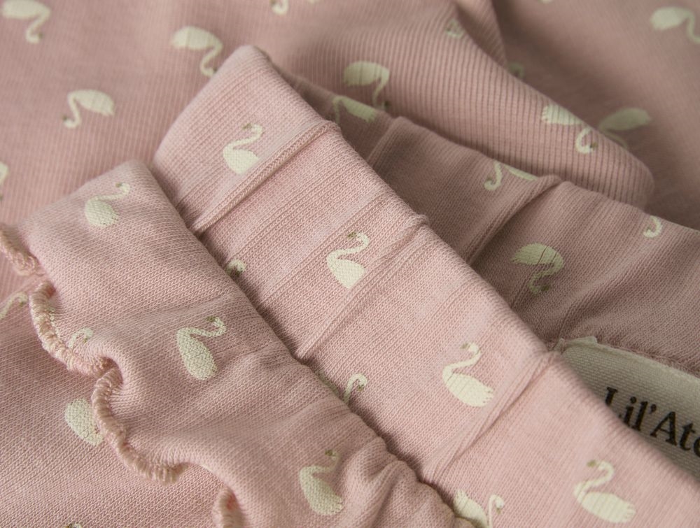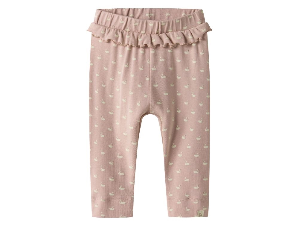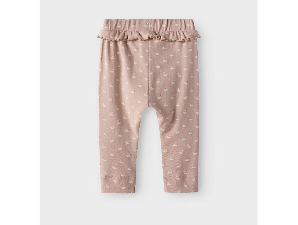 Leggings/bløde bukser i rosa nuance fra Lil' Atelier med yndigt svaneprint og flæsekant i livet.