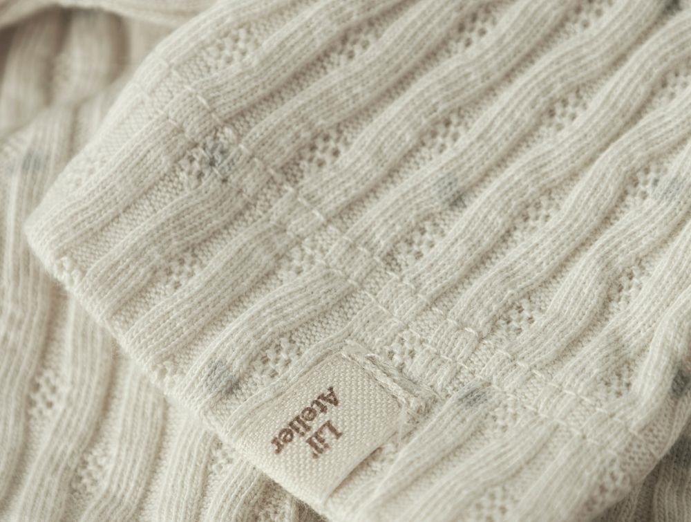 lil\' atelier leggings i creme med flæsekant og bindebånd, set forfralil\' atelier leggings i creme med ribstruktur og vævet logomærke, tæt på benkant