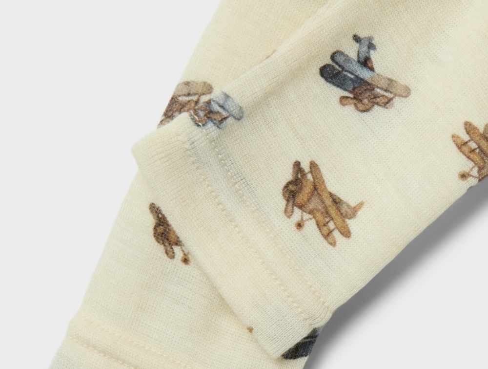 Uld bidrager med sine naturlige temperaturregulerende egenskaber, mens modal tilfører en silkeblød fornemmelse og sikrer, at stoffet holder formen. Materialet er åndbart, fugtabsorberende og behageligt for sart babyhud. Se flere styles i Lil' Atelier merinould.
