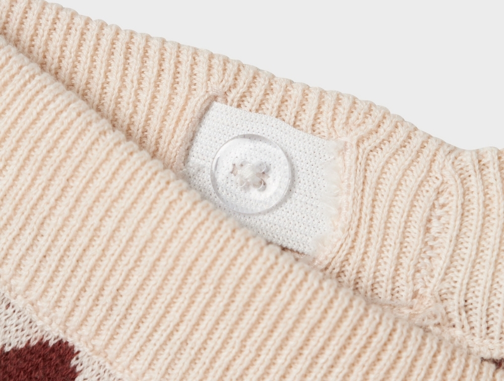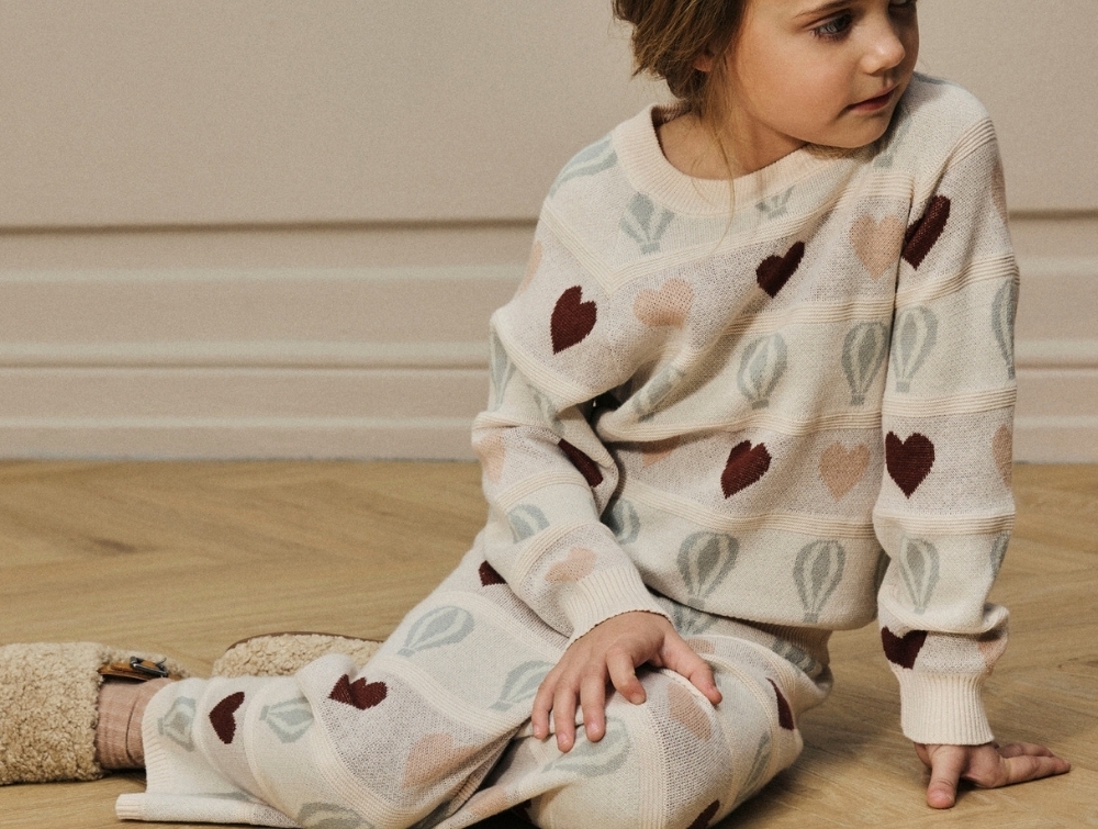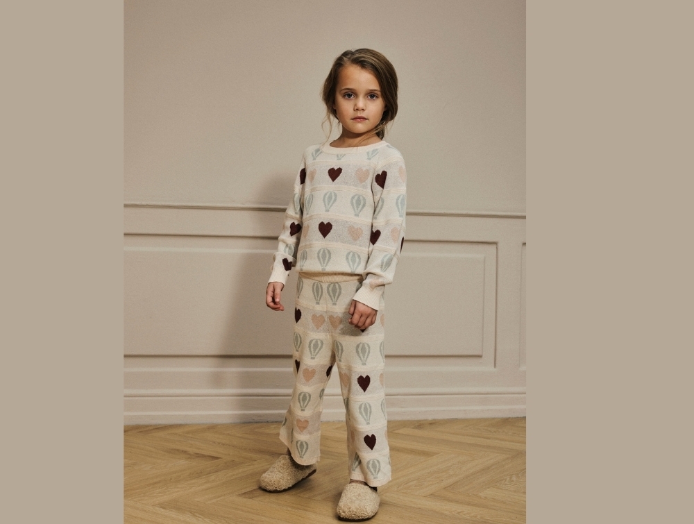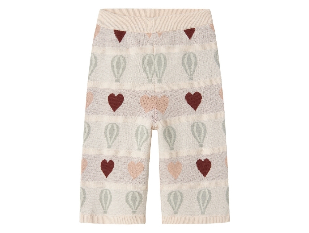 Bukser i creme nuance fra Lil' Atelier med jacquardstrikket mønster af hjerter og luftballoner i douce farver. Modellen har bred pasform med let beskåret benlængde og justerbar talje for ekstra komfort.