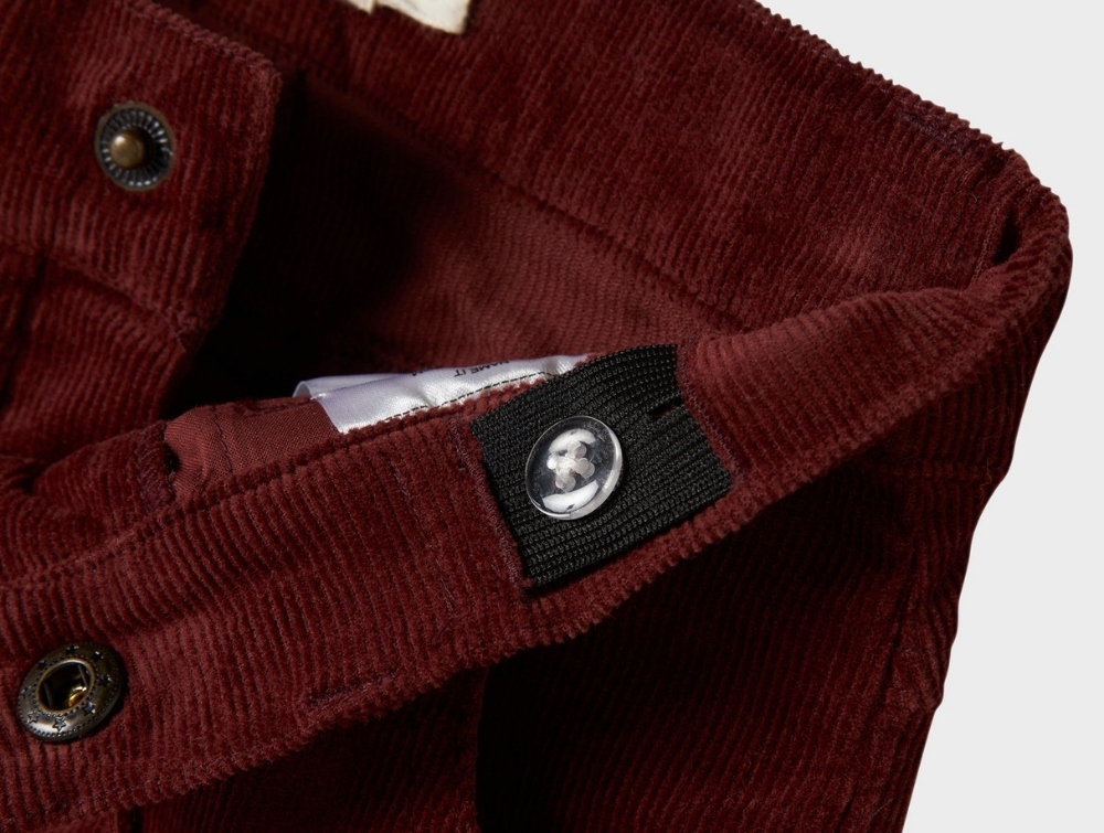 Fløjlsbukser i dyb rødbrun nuance fra Lil' Atelier. Bukserne har brede ben, forlommer og trykknaplukning foran. Den justerbare talje giver en fleksibel pasform, mens fløjlen tilfører en blød og klassisk tekstur.
