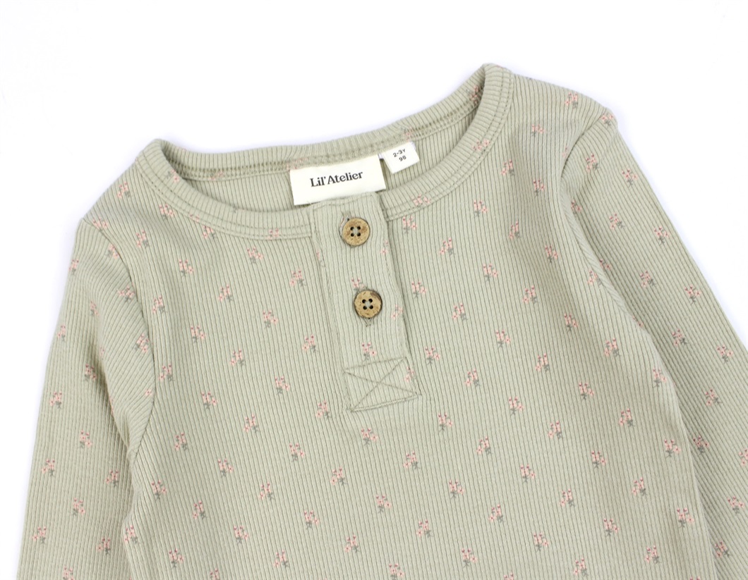 Langærmet top i farven moss gray med blomster og to knapper fra Lil' Atelier.