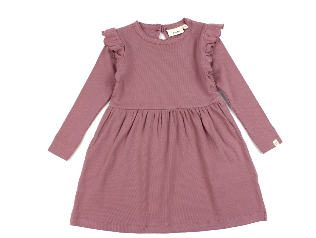 Blød kjole i farven nostalgia rose med flæser på skuldre fra Lil' Atelier.