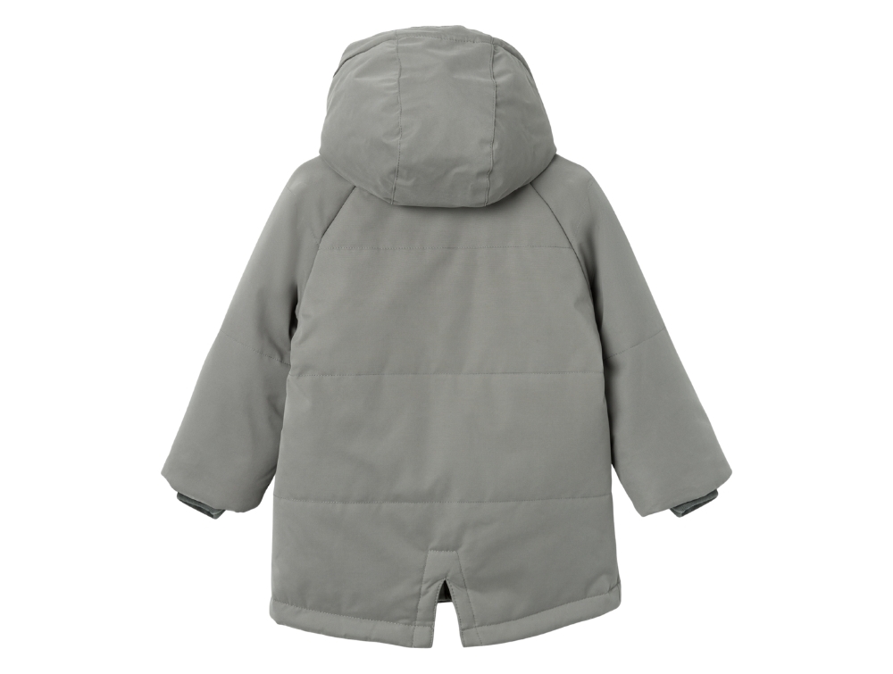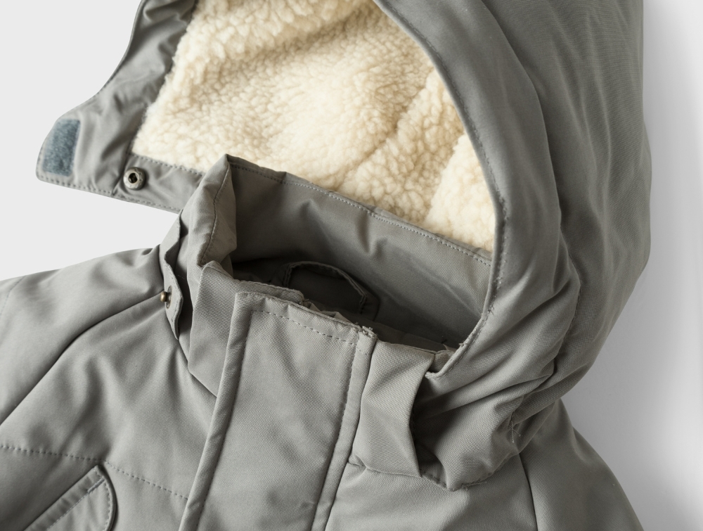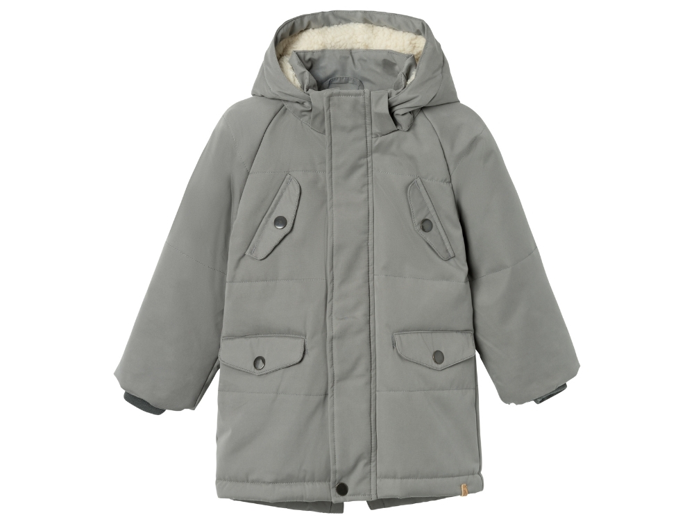Vinterjakke i farven pewter fra Lil' Atelier. Vinterjakken har en aftagelig hætte med trykknapper.