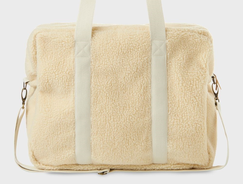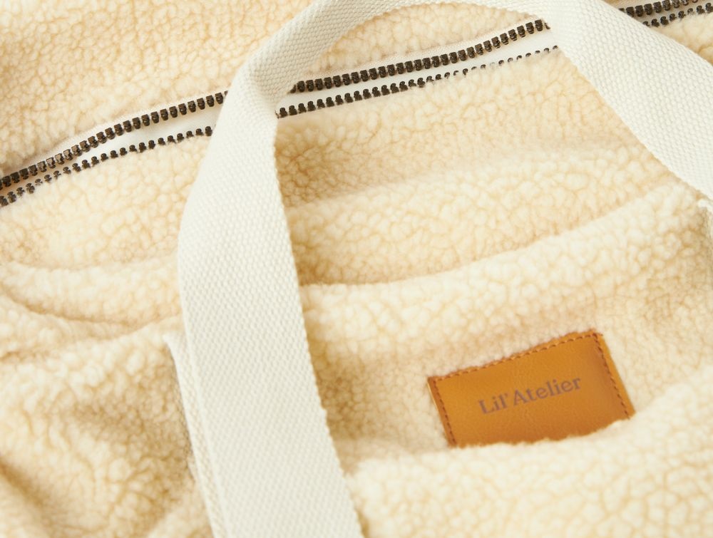 Praktisk og stilfuld råhvid pusletaske fra Lil' Atelier i blødt teddy-materiale med kraftige bomuldsstropper. Tasken er designet med funktionelle detaljer, der gør den ideel til hverdagsbrug med en baby.