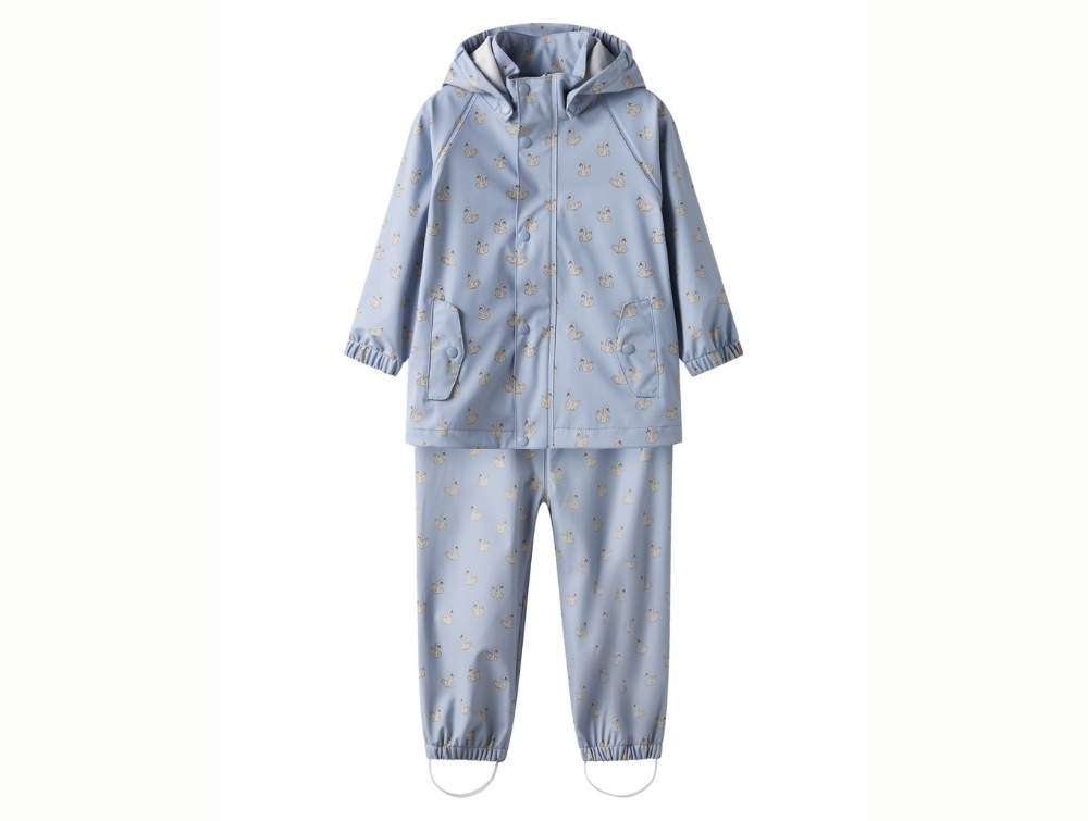 Regnsæt i blå nuance (zen blue) fra Lil' Atelier med fint svaneprint over hele sættet.