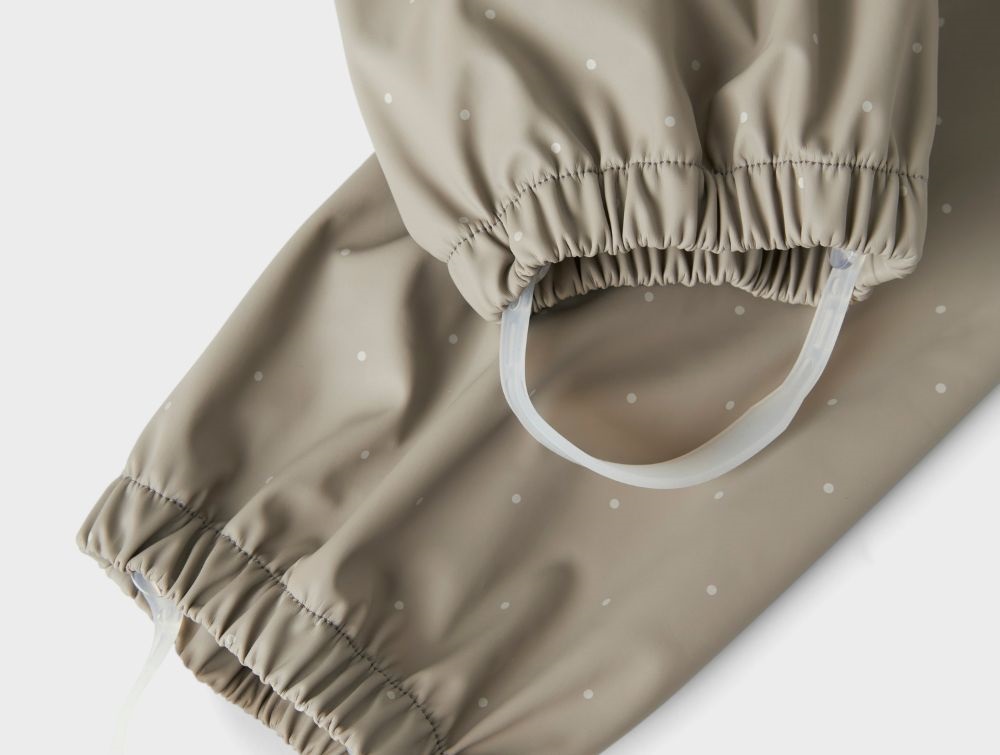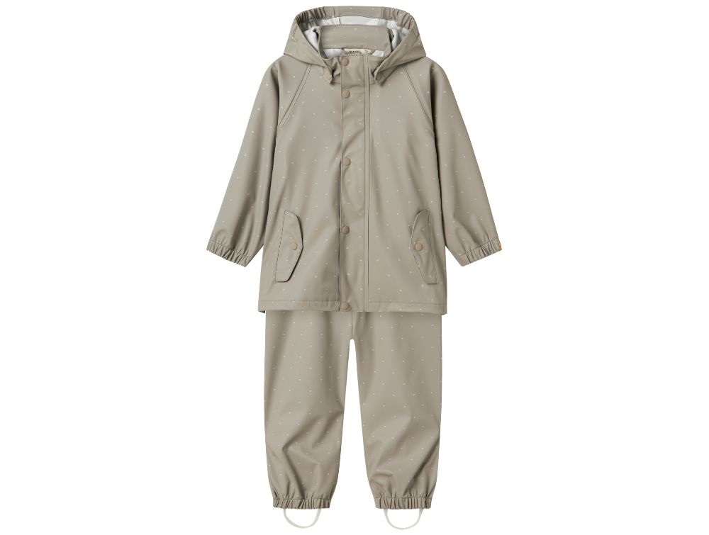 Funktionelt regnsæt fra Lil' Atelier i en flot varm grå nuance med små lysegrå prikker. Sættet består af en jakke og bukser, der er både vindtætte og vandtætte med en vandtæthed på 10.000 mm og svejsede sømme, der sikrer god beskyttelse mod regn.