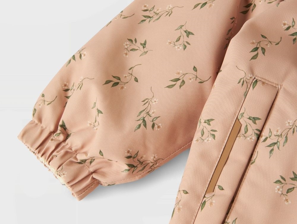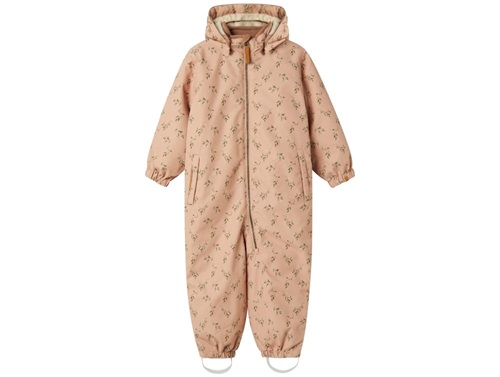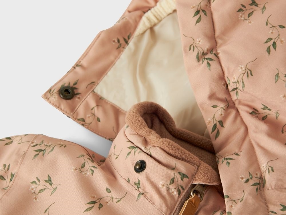 Flyverdragt i farven rugby tan med skønt blomsterprint fra Lil' Atelier. Flyverdragten har en aftagelig hætte med trykknapper.