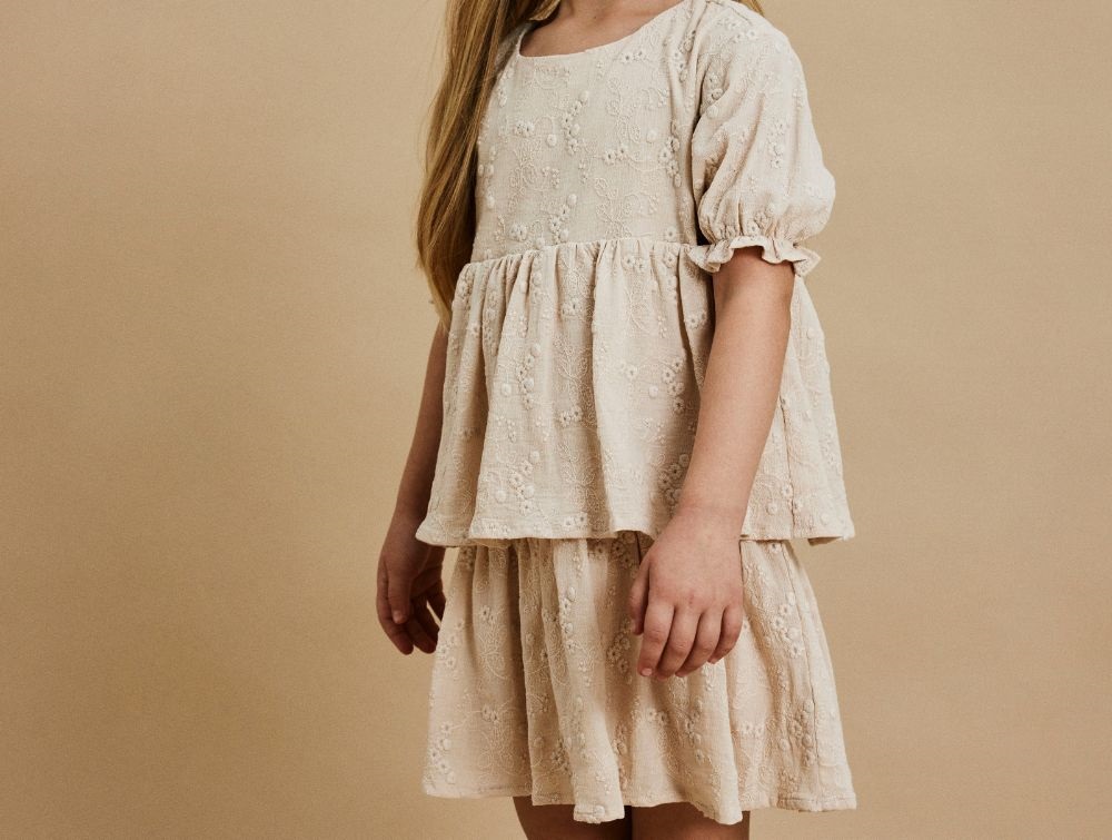 Kjolen er i det skønneste broderie anglaise med flæsedetaljer og pufærmer. Kjolen lukkes med tre knapper i ryggen og har underkjole i økologisk bomuld.