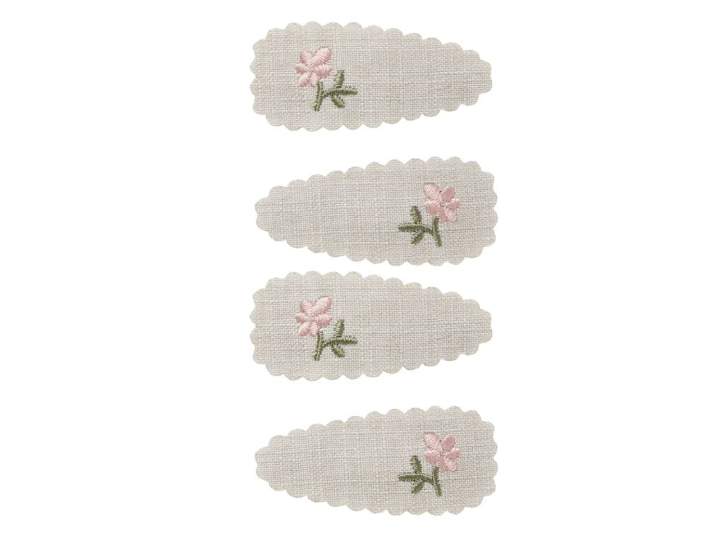 Pakke med 4 hårspænder i farven shadow gray med blomsterbroderi fra Lil' Atelier.