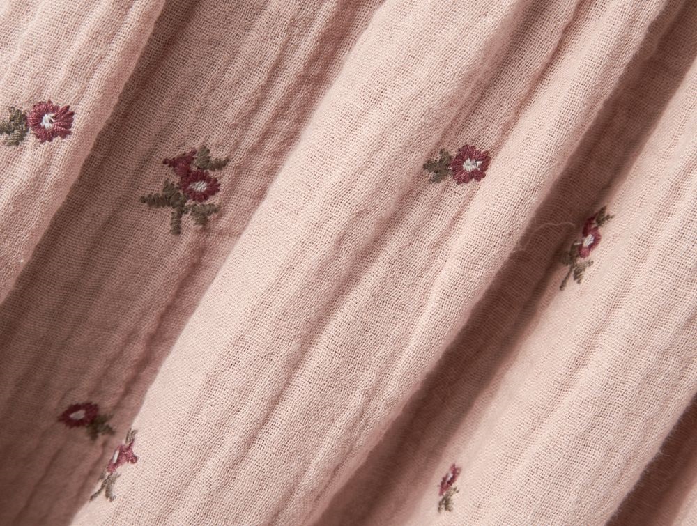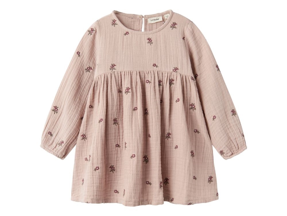 Kjole i farven shadow gray med blomsterbroderi fra Lil' Atelier. Produceret i 100% økologisk bomuld.
