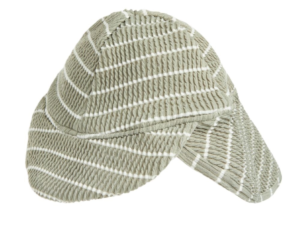 Stribet badehat i farven støvet grøn (forest fog) med smalle hvide striber fra Lil' Atelier.