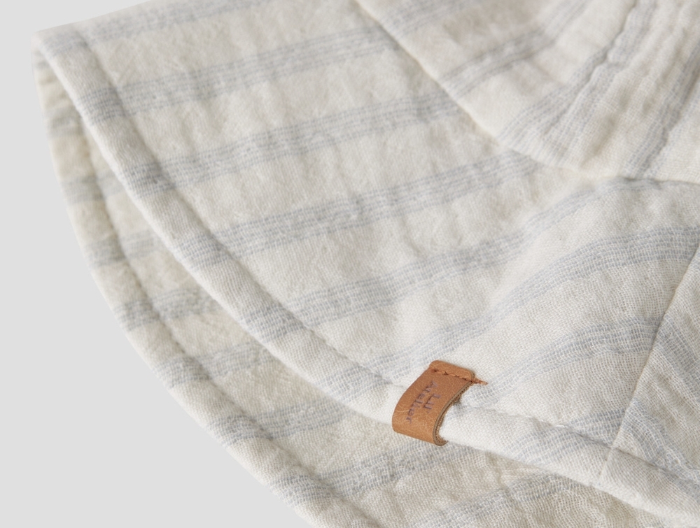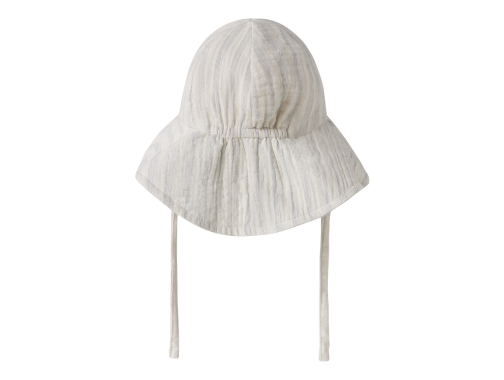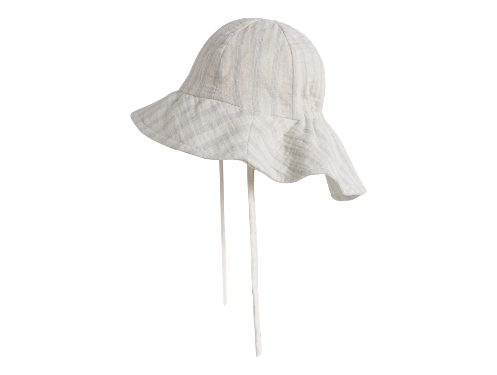 Solhat i råhvid nuance (coconut milk) fra Lil' Atelier med fine lyseblå (dusty blue) striber og bindebånd under hagen.