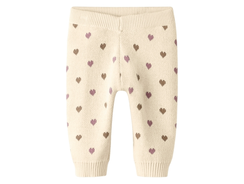 Strikbukser i råhvid nuance (turtledove) fra Lil' Atelier med små hjerter i brune og lilla toner.