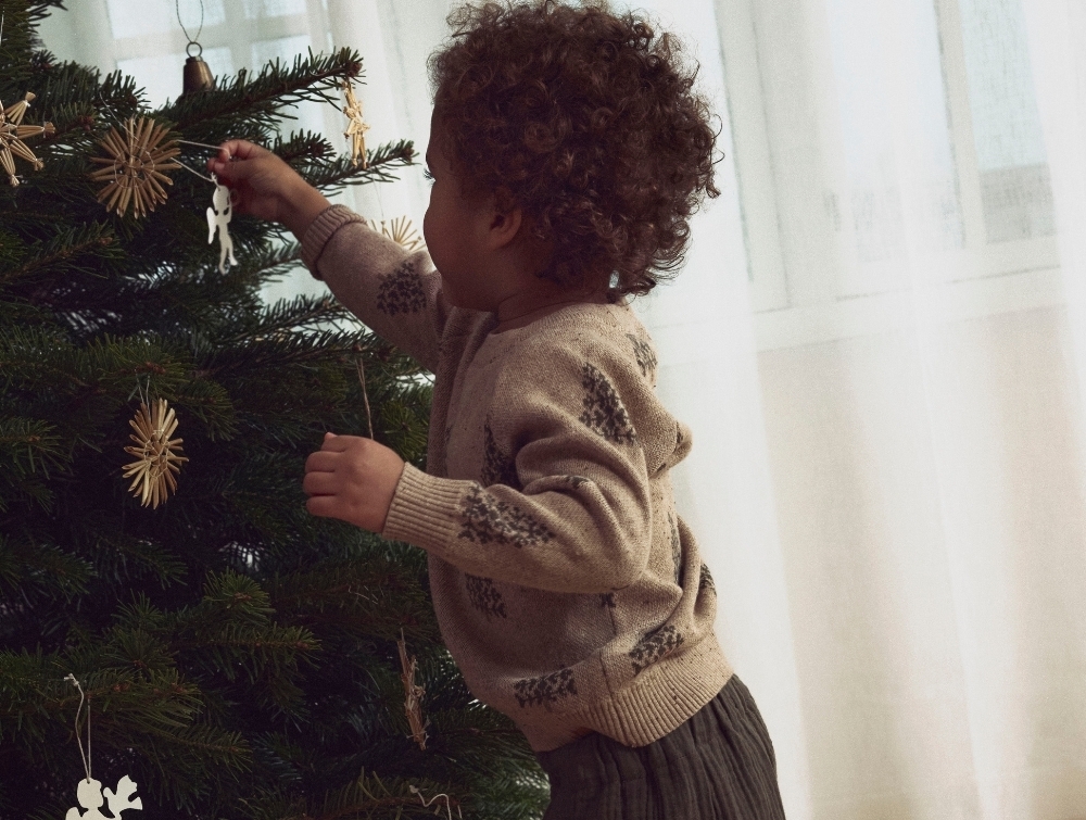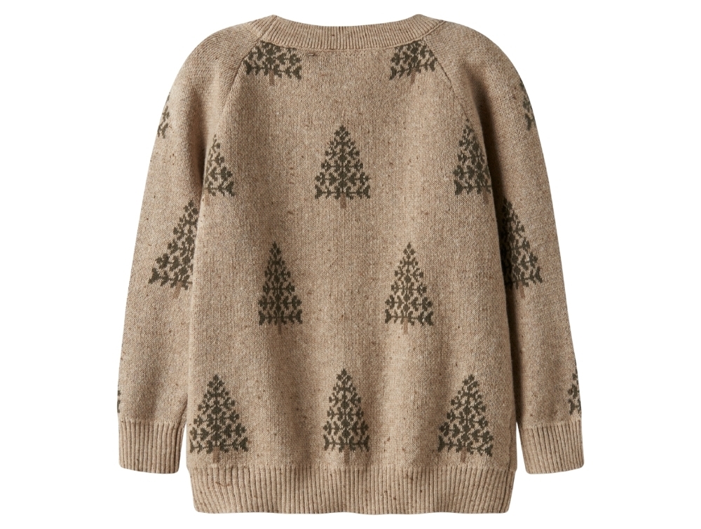 Lil\' Atelier striktrøje i oxford tan med juletræsmønsterBarn iført Lil\' Atelier striktrøje i oxford tan med juletræerDetalje af Lil\' Atelier striktrøje i oxford tan med ribkantBagside af Lil\' Atelier striktrøje i oxford tan med juletræsmønster