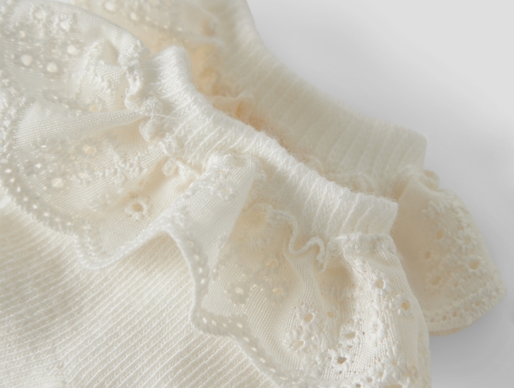 Designet har en klassisk pasform med rib ved anklen og en bred flæsekant, der giver et fint og detaljeret udtryk.
